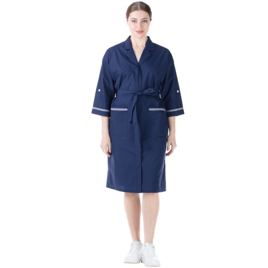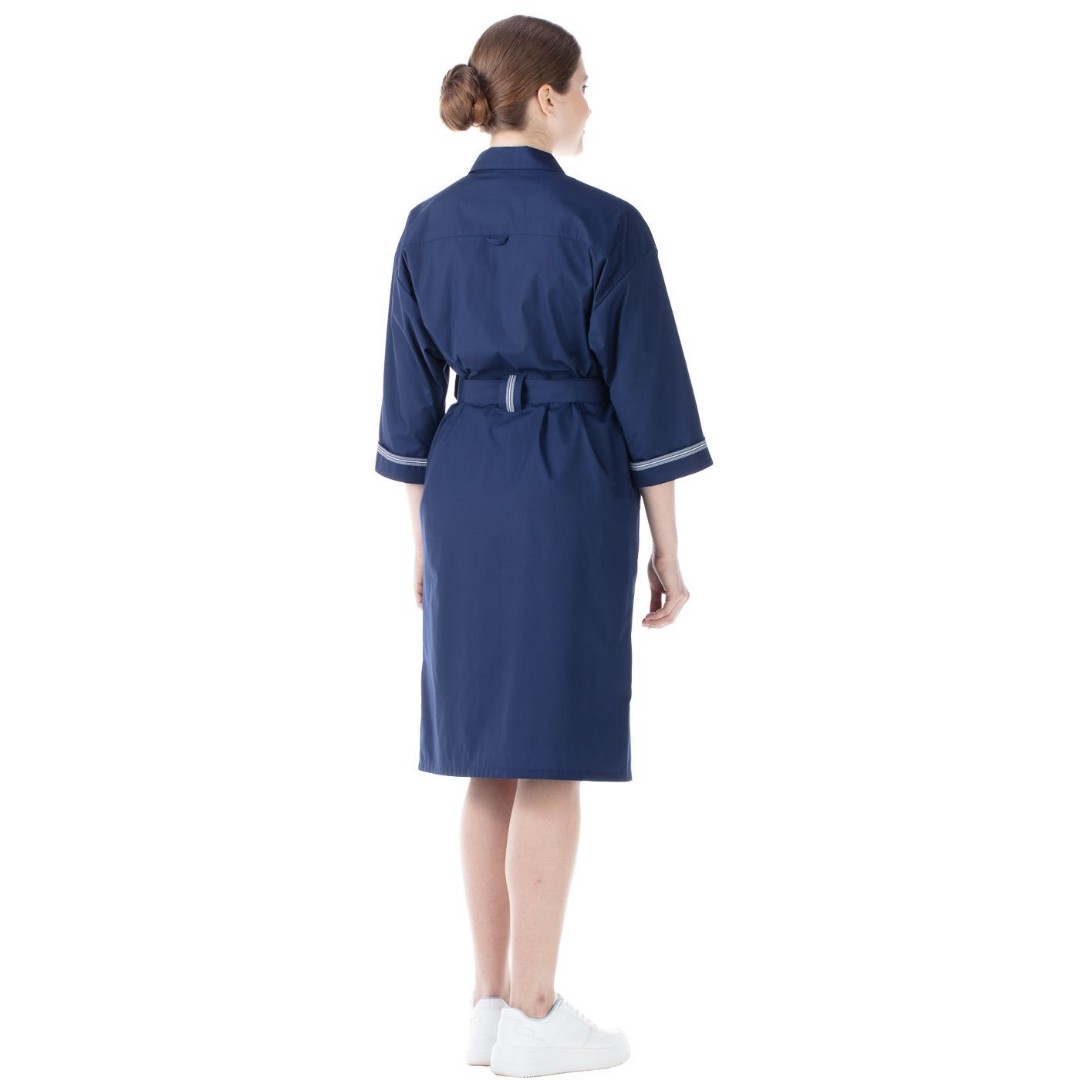 Рубашечный рукав со спущенным плечом и углубленной проймой подойдет для фигуры любого типа. Этот халат можно комфортно накинуть на медицинский хирургический костюм, можно носить без пояса.