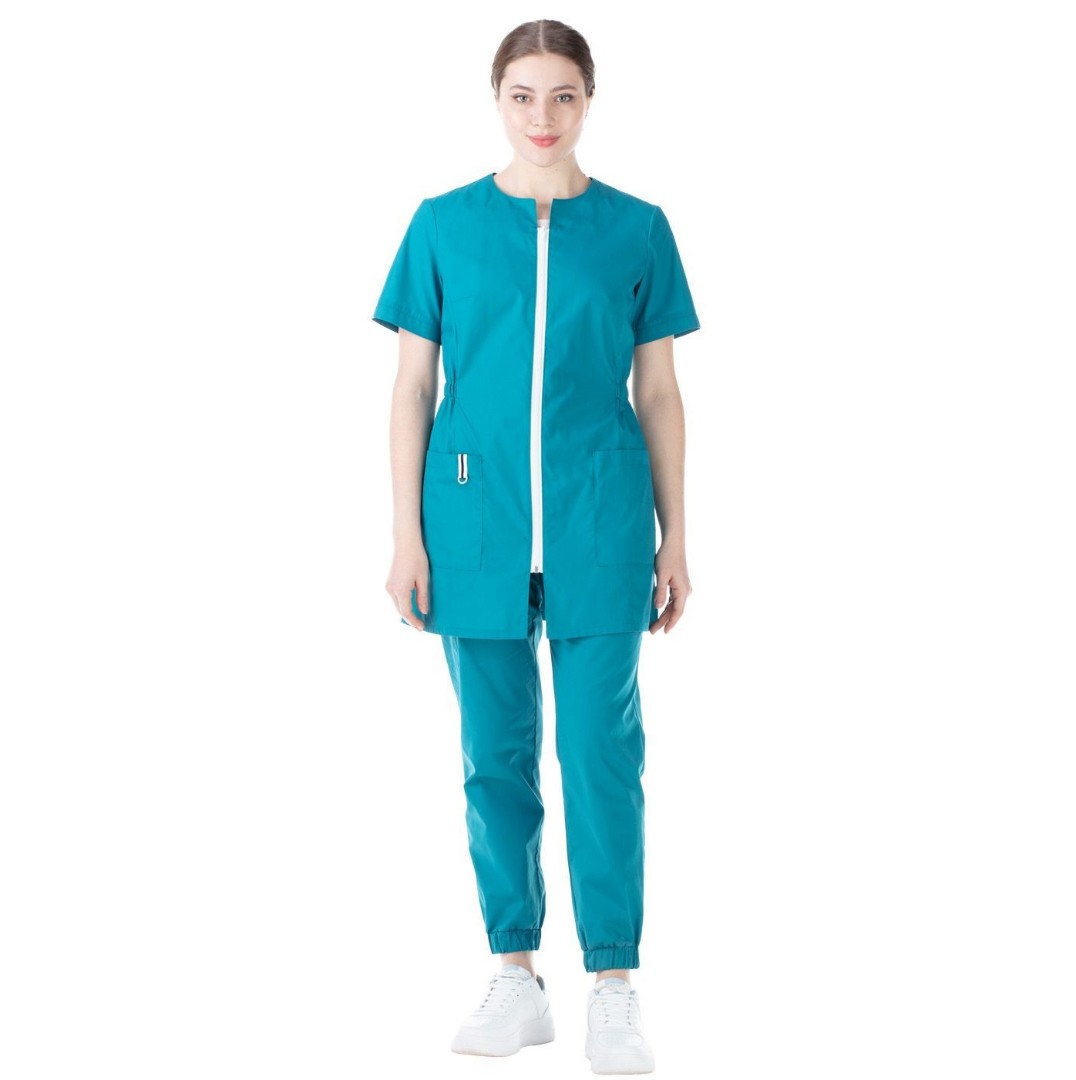 Блуза полуприлегающего силуэта до середины бедра с центральной застежкой на молнию. Горловина - округлая. На полочках рельефы и накладные карманы внизу с горизонтальным входом.