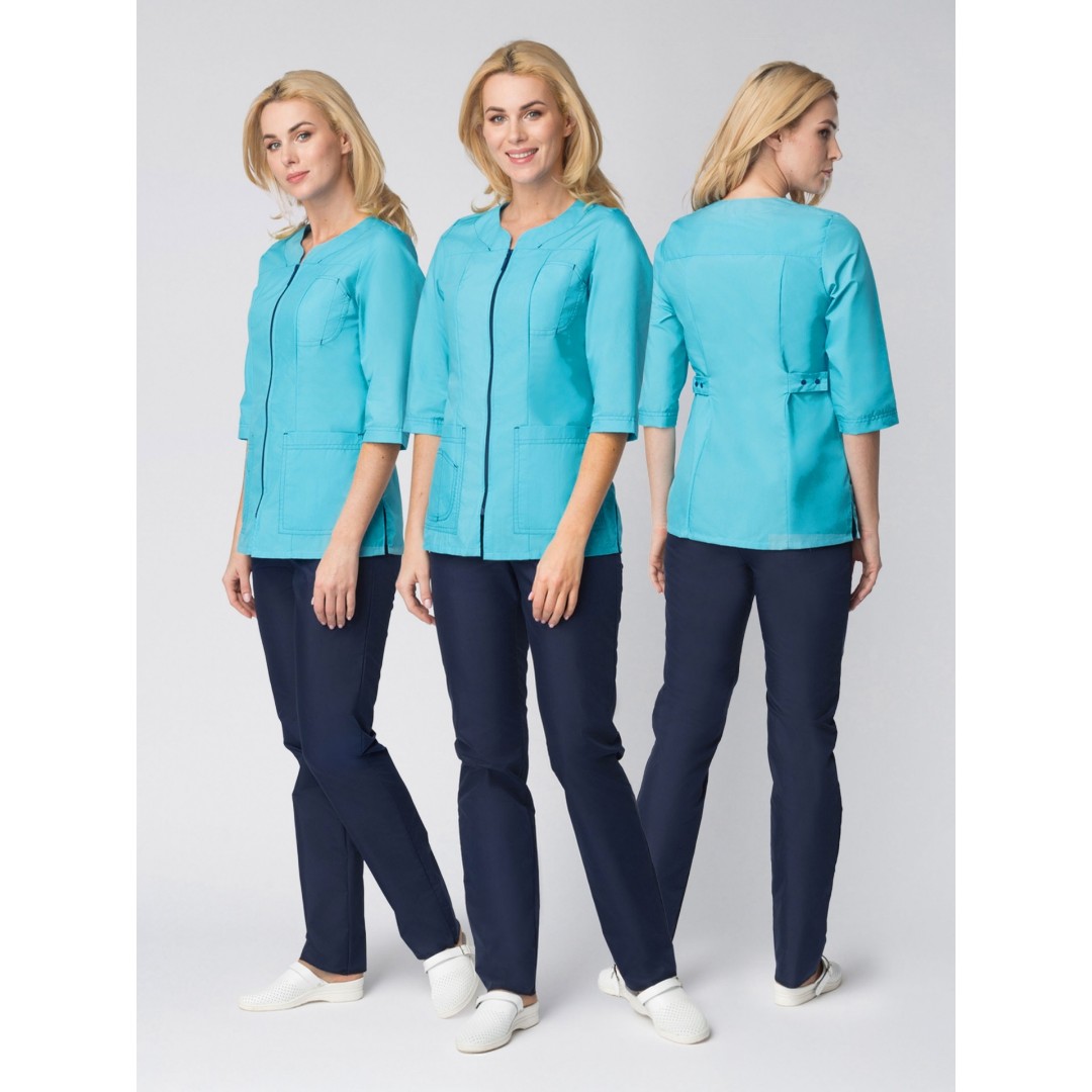 Костюм женский рабочий «Спринт» изготовлен в изысканных бирюзовых и синих оттенках в соответствии с ГОСТ. Спецодежда женская защищает от общих производственных загрязнений, механических воздействий и может выступать как медицинская форма, рабочая одежда для салонов красоты, массажных кабинетов и стоматологий. Костюм состоит из двух предметов: блуза женская и брюки. Элегантная блузка полуприталенного силуэта не стесняет движения, подчеркивает линию талии, удобно застегивается на «молнию». Оригинальные карманы с контрастной прострочкой придают костюму стильный внешний вид, практичны в повседневной деятельности. Прямые рабочие брюки с поясом на резинке замечательно сидят по фигуре, комфорты для работы. Модель брюк универсальна для женщин разного роста, т.к. регулируется по длине. Премиальные материалы рабочей одежды отличаются износостойкостью, приятны на ощупь.