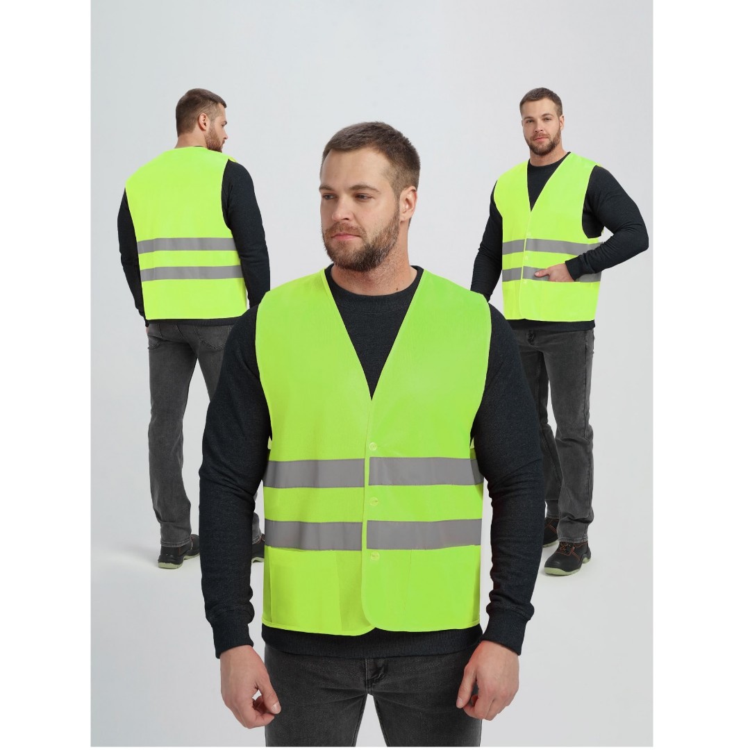 Особенности жилета:Две горизонтальные светоотражающие полосы (СОП) шириной 50 мм обеспечивают повышенную видимость в темное время суток и в условиях плохой освещенности.Центральная застежка на пуговицы для удобства и надежности.Два боковых кармана для хранения мелких предметов и инструментов.