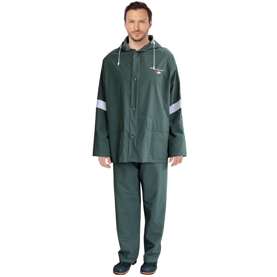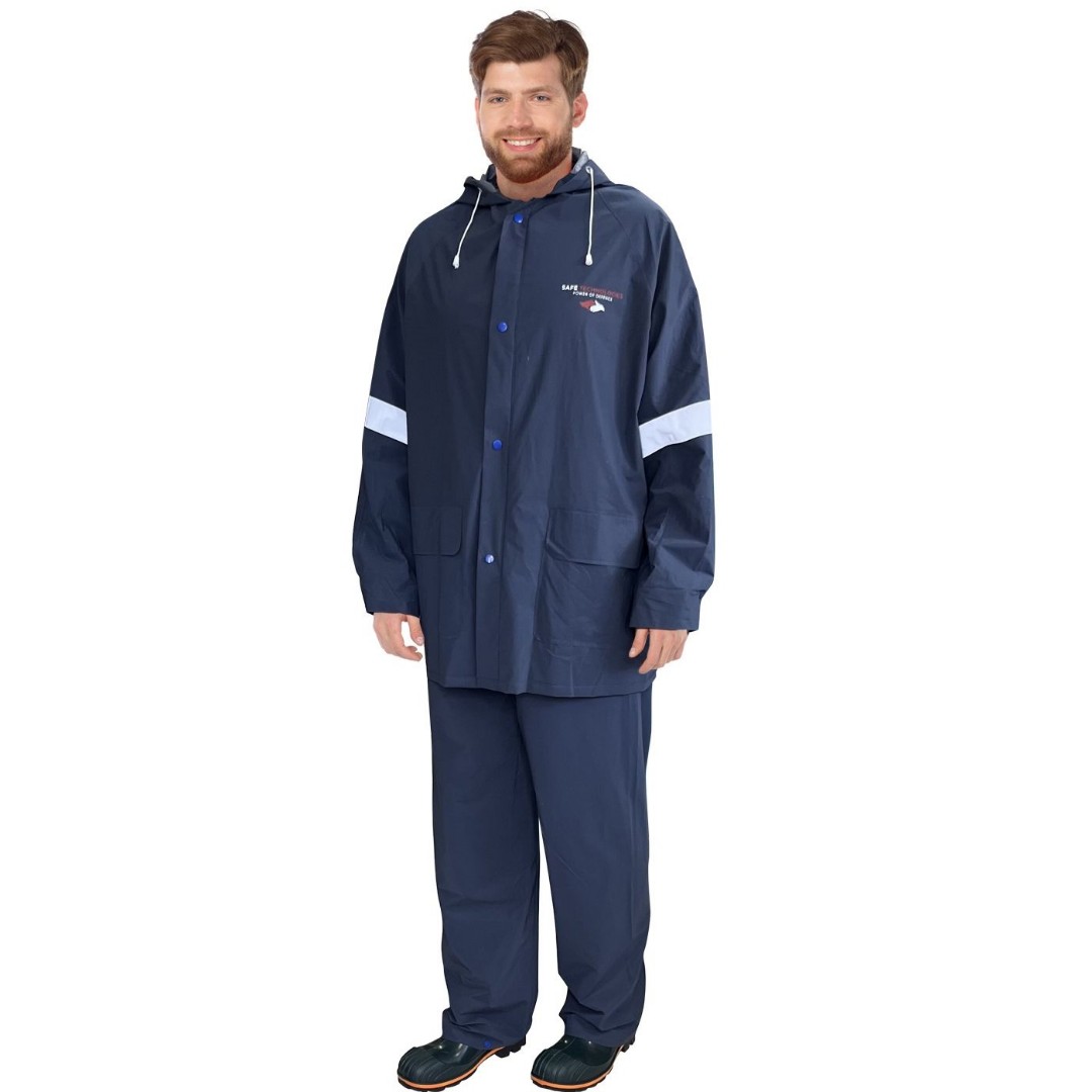 Костюм изготовлен из материала ПВХ/полиэстер 90/10%, этот материал имеет плотную структуру, что повышает износостойкость при использовании.