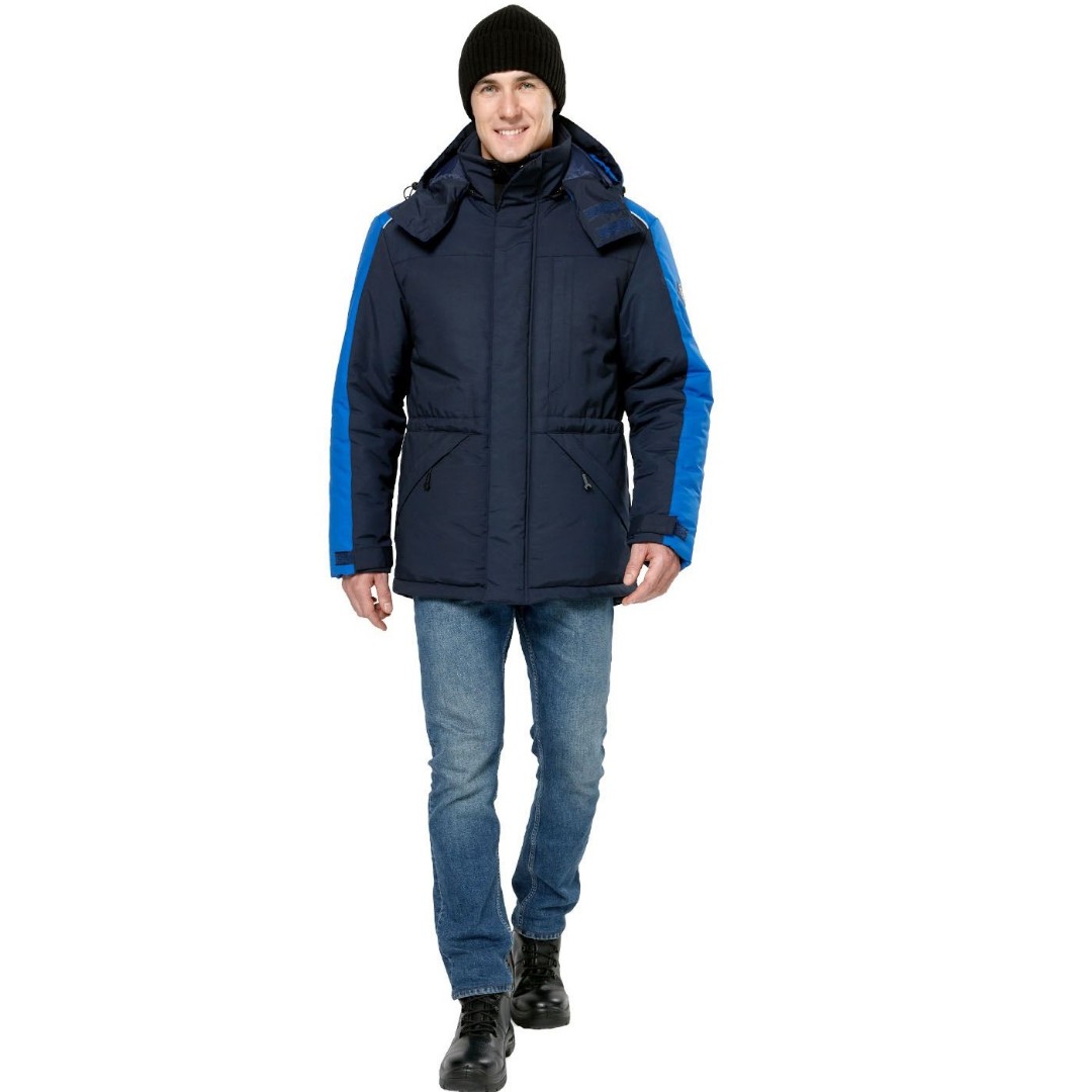 Куртка мужская утепленная прямого силуэта, с центральной застежкой на молнию под ветрозащитной планкой на кнопках, усиленных дополнительно тесьмой.