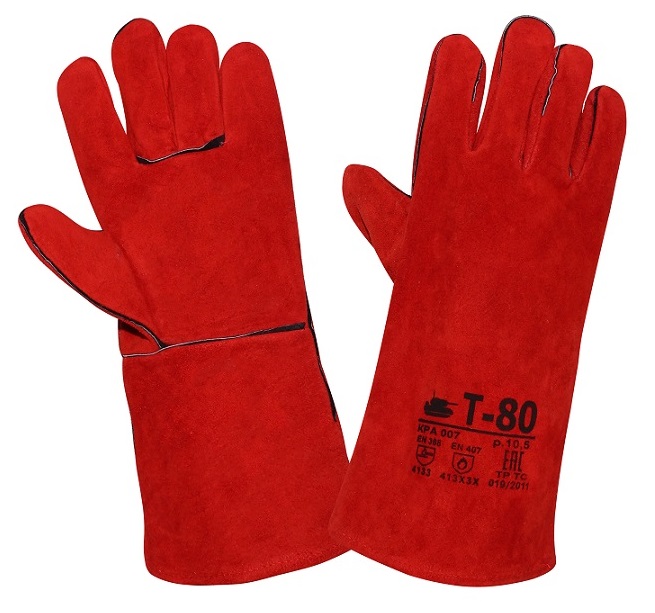 Перчатки сварщика (краги) Т-80 спилковые красные предназначены для защиты рук от механического воздействия (истирание, прокол, порез), искр и брызг расплавленного металла и работ в условиях повышенных температур. Перчатки пятипалые с подкладкой из флиса и брезента, длина 350 мм ( 10/-5мм). Окрашенный спилок КРС сорта АВ (1,4 /- 0,2 мм), обработка, обеспечивающая сохранение мягкости спилка в течение длительного времени хранения, швы усилены вставками из кожи черного цвета, используется специальная упрочненная нить.